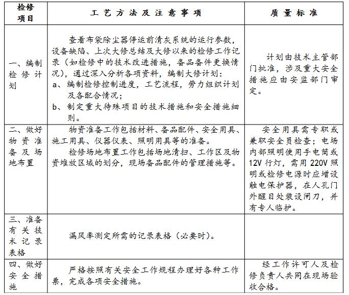 化工廠布袋除塵器工藝方法和檢修注意事項,質(zhì)量標(biāo)準看下圖: