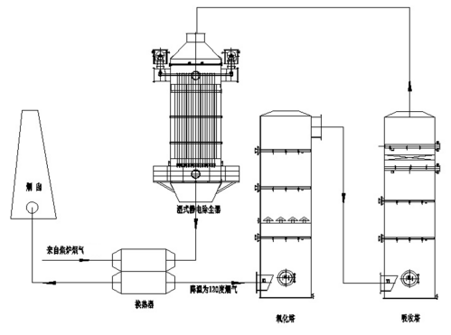 在焦?fàn)t煙氣進(jìn)脫硫塔前面的高溫?zé)煔舛渭皾袷诫姵龎m器后面各增加一套GGH或者M(jìn)GGH設(shè)備;在高溫?zé)煔舛谓?jīng)過(guò)GGH或者是MGGH換熱后,將換熱后得到的熱量傳遞到低溫段,將低溫段煙氣溫度提高,使得煙氣溫度提升而達(dá)到“脫白”效果。
